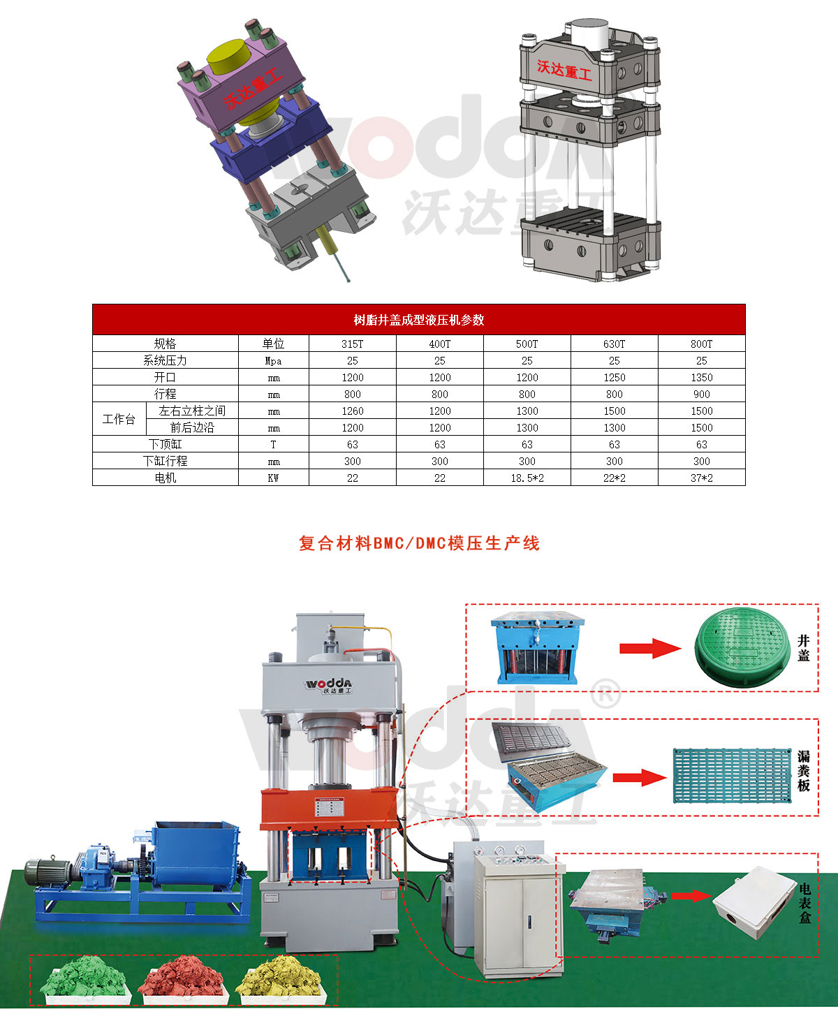 山东沃达重工设计生产的树脂井盖专用液压机常见有315吨、400吨、500吨、630吨、1000吨五种机型,分为一模一块和一模多块两种形式,模具为电加热。315吨树脂井盖成型液压机是生产制造树脂井盖的常用机型。