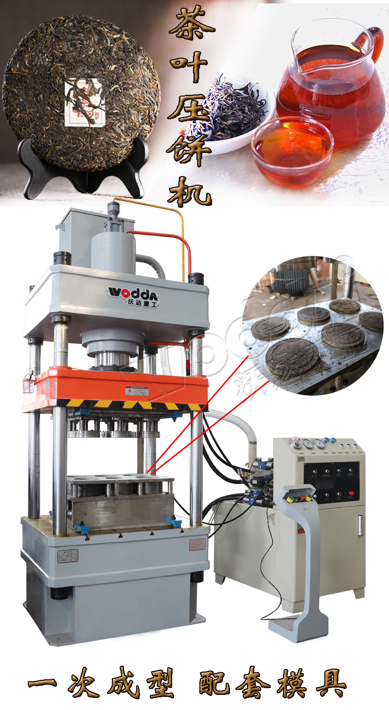山东沃达重工机床有限公司生产的茶叶压饼机,采用三梁四柱液压机结构,并可以根据客户需求定制不同花纹和形状的茶饼/茶砖模具,茶叶压饼机带有顶出脱模缸,可以根据客户需要配置PLC控制系统,实现半自动化生产。