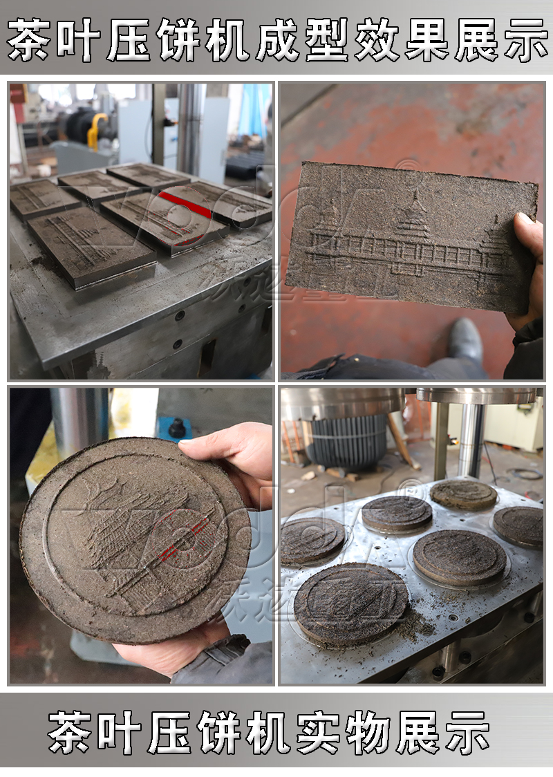 基本工艺流程是:茶叶蒸熟--布料--压制--主缸回程--顶出脱模--取出茶饼/茶砖。