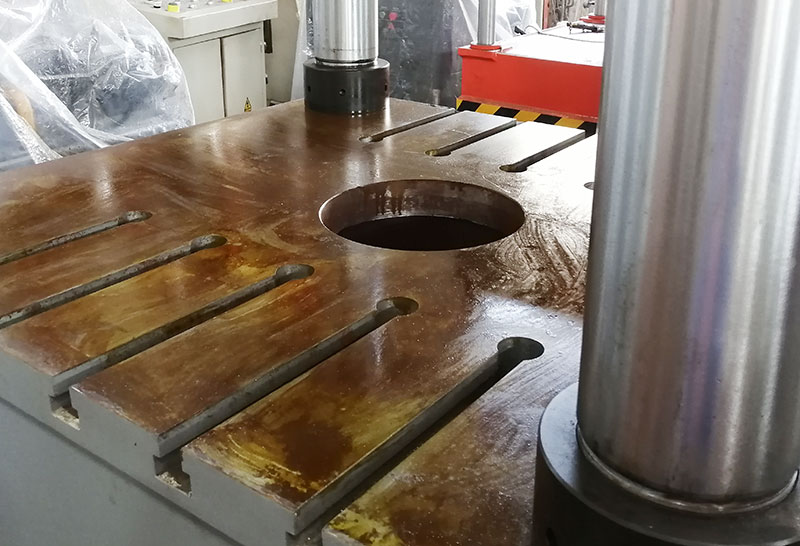 630吨活性炭成型液压机_630吨四柱液压机是山东沃达重工生产的一款多功能四柱液压机,主要用来进行活性炭的挤出压制成型,配备伺服系统和可触屏PLC控制系统,能耗低、噪音小。这款液压机的主要特点是行程、开口比较大,且工作台中间留有下料孔。在实际生产中,被模具挤出的活性炭条通过下模孔、工作台下料口掉落,可以根据客户生产需要配备自动化传送带进行落料收集。