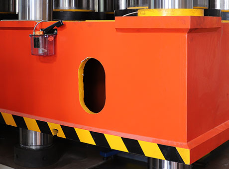 6、630吨四柱液压机由机身、主缸、行程限位装置、润滑装置、液压动力系统及电气系统等部件组成,机身是由上梁、滑块、工作台、立柱、锁母、导套等组成,滑块在油缸驱动下沿着四柱上下直线运动。