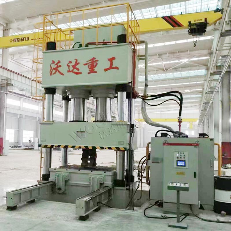 1200吨四柱液压机采用独立的液压系统,油泵、电机、阀集成在油箱上部,通过液压油管与主机的油缸相连。油箱正面设有压力仪表和远控开关,可以观察和设置压力上限和流速;液位计可以观察油箱内部液压油的余量;温度计可以显示液压机的实时温度;油箱侧面置有大功率风冷设备或者水冷装置,用于液压油的及时有效降温。