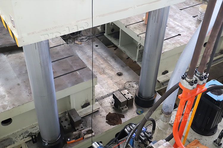 本机是一台1500吨四柱液压机,三梁四柱式结构,四缸设计样式,台面1800x1800mm,滑块行程2000mm,主要由机身、滑块、主油缸、移动工作台、润滑装置、加热装置、行程限位装置、液压动力系统及电力控制系统等部位组成。四柱式结构机身设计,整机刚性好、精度高、操作简单方便。配合双工作台设计,提高生产效率。成型温度、压力、速度、加压时间全部都可以在触摸屏设定、调节,实现自动控制;预压压力、速度均可调。