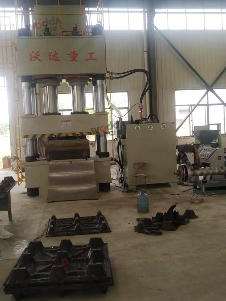 塑料托盘成型液压机是一款专用模压塑料托盘成型的机器设备,有四柱式、框架式两种结构,常用800吨、1000吨、1250吨、1500吨、1800吨、2000吨等。山东沃达重工液压机厂家塑料托盘成型液压机设计制造案例较多,设备稳定性能好,生产效益高,耗能省,灵活多变,更换模具便捷,可生产各种规格托盘,安装方便,无需基础定位,放置平整即可生产。常见的塑料托盘液压机机型有800吨四柱液压机和1000吨四柱液压机两种,用户也可以根据塑料托盘尺寸以及材质选择其他合适的机型。