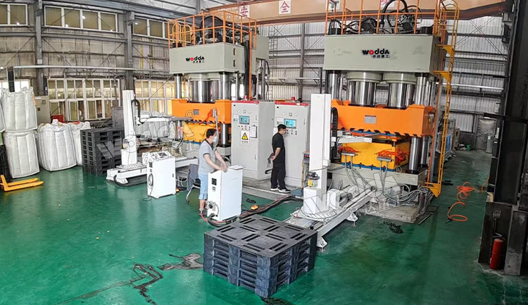 一条标准的塑料托盘生产线,其核心设备主要包括原料粉碎设备,用于将原料进行预处理;生产设备,如塑料托盘液压机,负责将塑料原料加工成托盘形状;托盘模具,用于成型和固定托盘形状;以及机械臂,用于自动化取件和搬运。