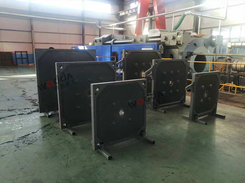 4、模压:将箱内原料加入模具内通过聚丙烯压滤板成型液压机(2000吨液压机)压制成型;