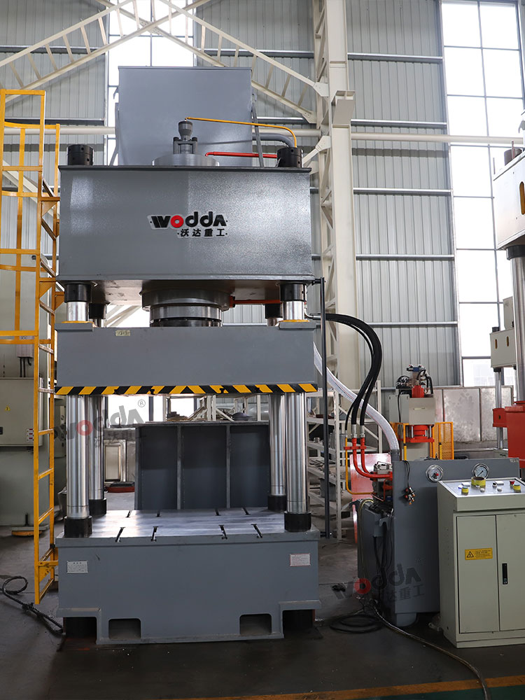 500吨四柱液压机是山东沃达重工液压机厂家为某板材加工厂家定做的液压压力机,机器公称压力5000KN,液压机工作台面有效尺寸1400x1300m,液压缸最大行程800mm,开口高度1000mm,本系列压机是一种通用设备,更换模具即可生产其他工件。本机的工作压力,压制速度,行程均可根据工艺需要在规定的参数范围内调节。