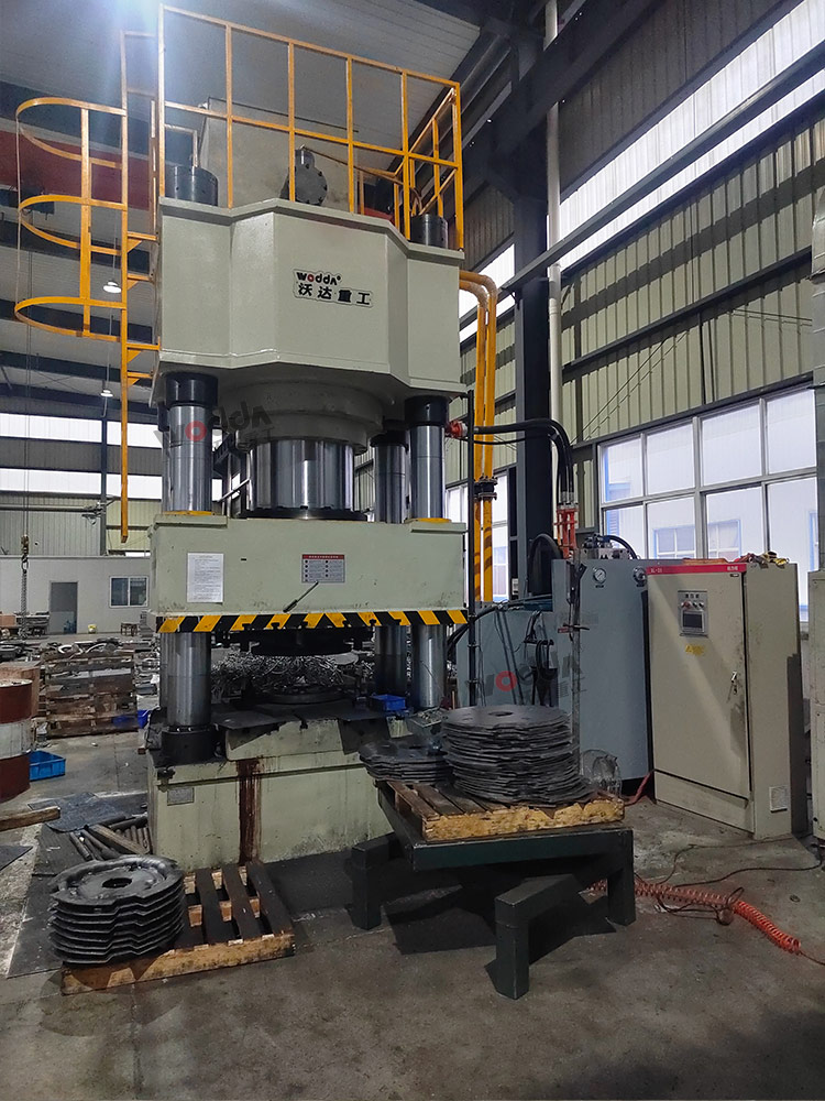 1000吨四柱液压机在冲压汽车配件的生产中具有高力输出、稳定性和均匀性、适应性和灵活性、精确控制以及提高生产效率等优势。这些优势使得汽车配件成型液压机(1000吨四柱液压机)成为汽车钣金件加工中重要的设备,能够满足对钣金件形状和质量的要求,并提高生产效率和产品质量。1000吨四柱液压机采用单缸设计,三梁四柱结构,配有PLC和伺服液压控制系统,是沃达重工根据客户要求设计生产的汽车离合器片生产设备。