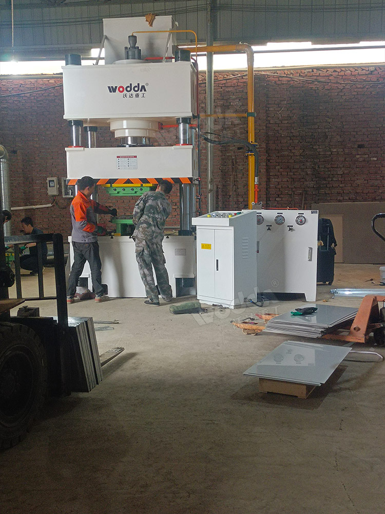 400吨不锈钢水箱板液压机是山东沃达重工在400吨四柱液压机的基础上改良设计的,采用先进的液压系统工作原理,自动化程度高,工作效率高,四柱导向成型压力大,可冲压1000x1000mm、1000x500mm和500x500mm等不同尺寸的不锈钢水箱板,也可以直接冲压成直角水箱,配合不锈钢水箱模具,一次冲压成型,是目前冲压不锈钢水箱最理想的设备。
