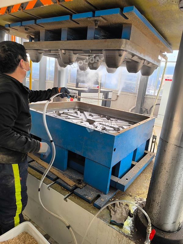 压制成型:启动设备,通过液压系统和加热系统对原料进行压制和加热,使其成型为木屑托盘。