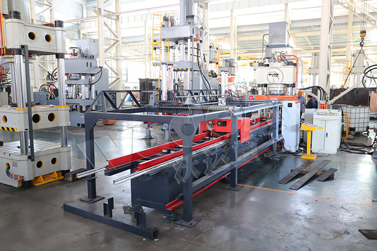 由自动送料机将钢板抓取传送到矿用锚杆托盘液压机工作台面的模具上,等待拉伸冲孔;