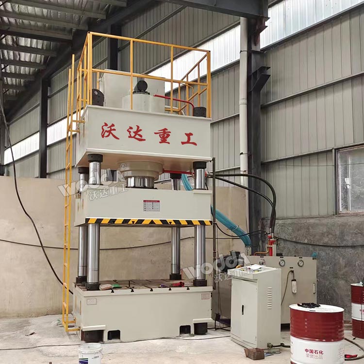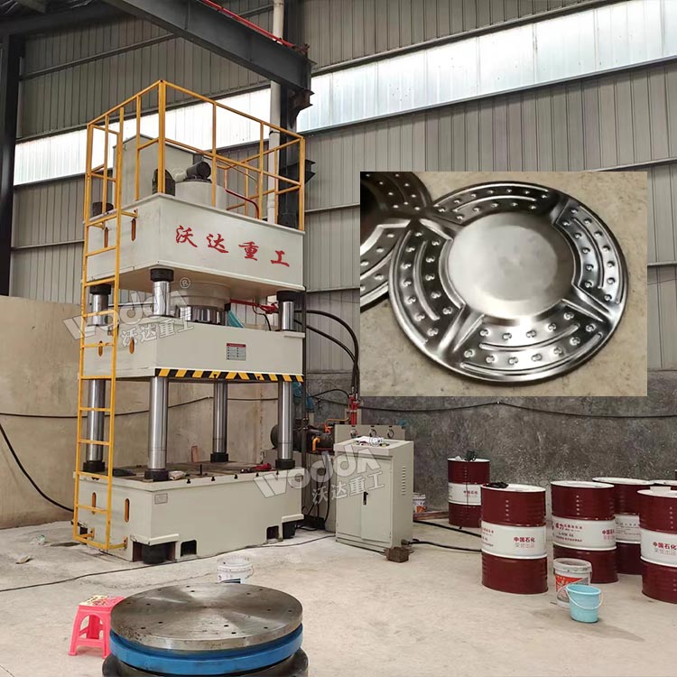 630吨不锈钢水塔盖拉伸液压机是山东沃达重工设计制造的一款630吨三梁四柱液压机,采用一次拉伸成型工艺,专门用于不锈钢水塔盖拉伸成型的液压设备。机身采用三梁四柱式结构,工作台下面布置有一个下顶缸(通常为100吨),用于辅助成型和脱模。630吨三梁四柱液压机具有高效性、高精度、节能环保、稳定耐用等特点,适用于金属厚薄板的拉伸成型,多在金属制品、家具、汽摩配件、五金配件、管道等行业使用。