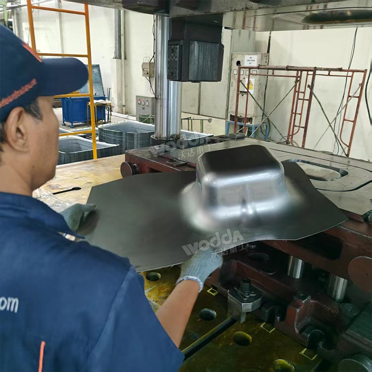 1000吨四柱液压机,又称1000吨液压机,型号YQ32-1000T,是根据客户需求设计制造的汽车变速箱油底壳生产设备,采用拉伸成型工艺,采用四柱式结构,由主机、液压系统、电气控制系统和辅助装置等组成,具有结构紧凑、操作简便、压制力大等特点。采用独立的电气控制系统和PLC可编程控制器,工作可靠,动作客观,维修方便。适用于汽车零部件的冲压、拉伸和成型等工艺。