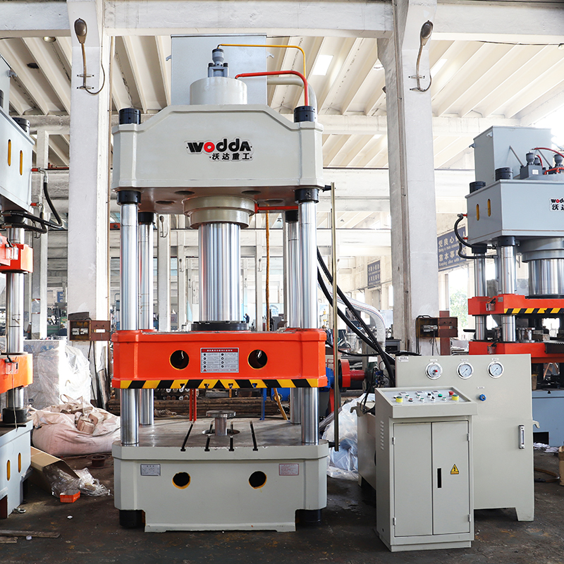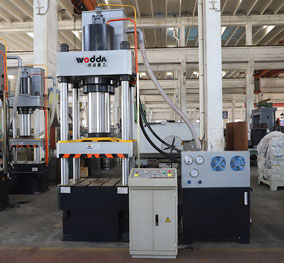 本文介绍的800吨四柱液压机是山东沃达重工为客户生产的一款冲压汽车配件的设备,主要由机身、液压泵站、电气控制系统三大部分组成,整机结构设计全部采用PLC+工业触摸屏控制,使其具有良好的强度和刚度,同时兼顾外形美观。液压泵站借助于电气控制系统完成对液压机各种动作的控制,稳定可靠、节能环保、自动化程度高。工作压力、压制速度、行程范围可调,可完成自动顶出循环,无需顶出和拉伸。有定压和定程两种成型工艺可供选择。