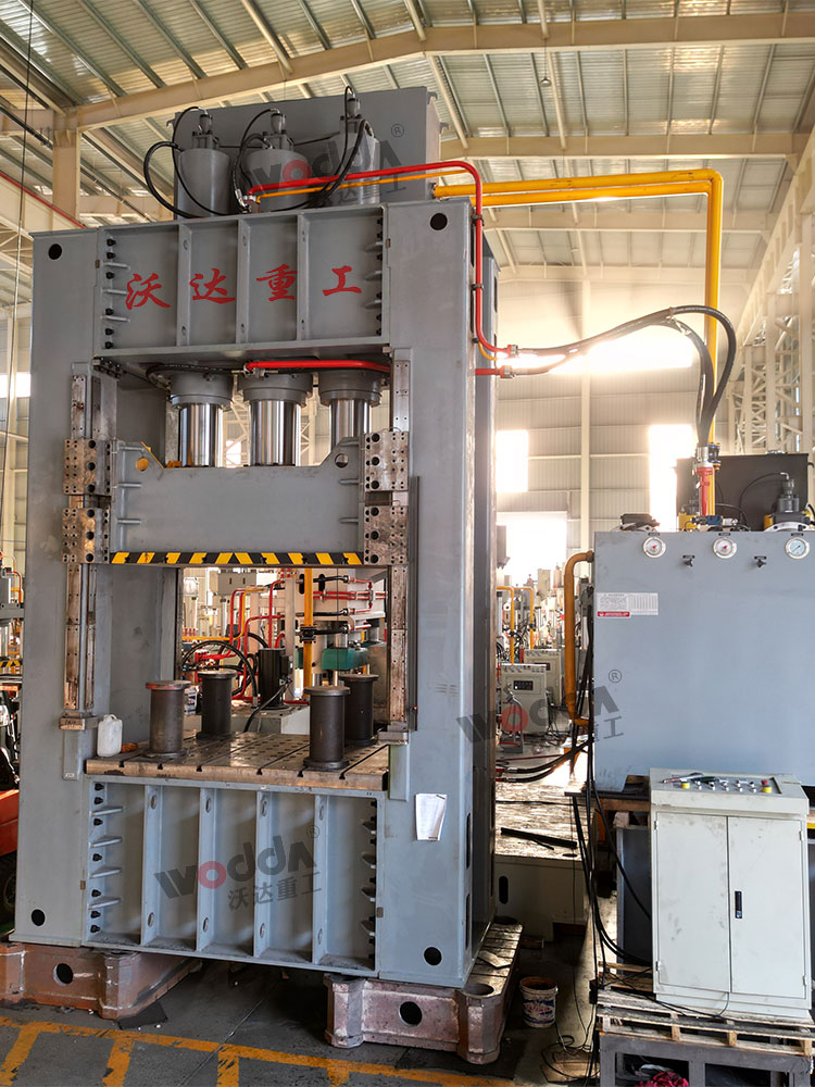 800吨框架式液压机又称框架式油压机、框架式压力机,机身采整体框式机身结构,主要构件为钢板焊接结构。滑块采用斜楔式四角八面导轨导向,具有刚性好、精度高、抗偏载能力强的优点。800吨框架式液压机配有液压垫,选配伺服数控系统及PLC触摸屏等,本机是山东沃达重工液压机厂家为用户设计、制造的框架式薄板拉伸液压机,主要用于汽车配件、零部件拉伸成型工艺,具有工作速度快、节能环保、精度高、维护方便等优点。