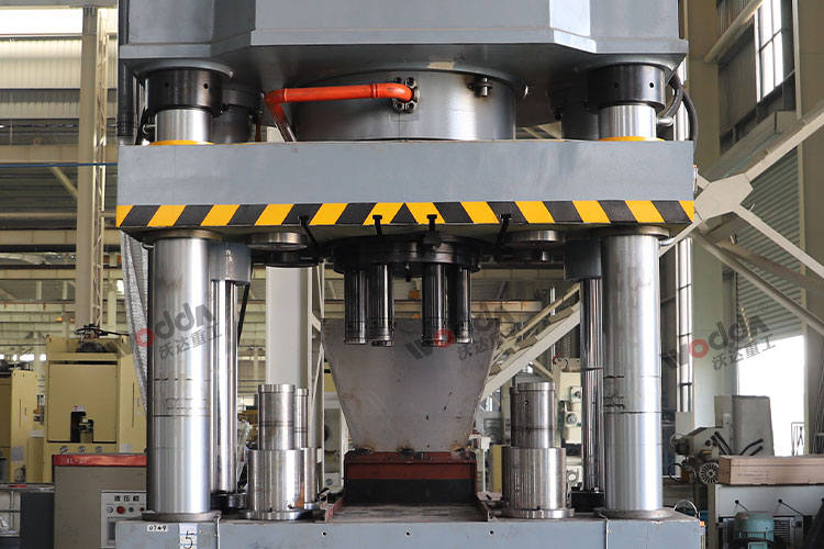 800吨四梁四柱液压机是一款常见的粉末成型液压机,可用于金属粉末、陶瓷粉末、石墨粉末、非金属粉末等粉末制品的压制成型。还可作为双动薄板拉伸机来使用,实现板材的深拉伸工艺。800吨四梁四柱液压机与三梁四柱液压机相比,多出一道脱模梁,保护性脱模方便,采用液压传动,电脑控制,故障率低,运行平稳,快速动作,标准密封件,从而能保证连续运转时不减弱油缸压力,维护容易,经久耐用、磨耗低。本文就是一台800吨金属粉末压块机_800吨四梁四柱液压机。