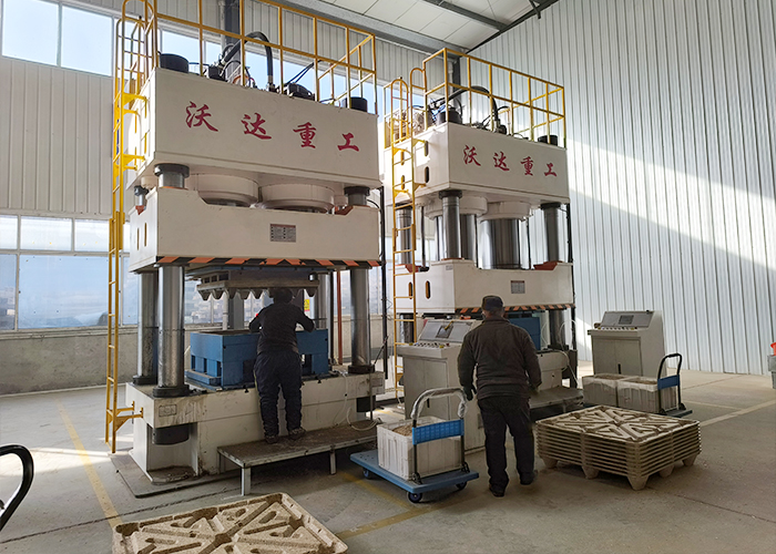沃达重工提供高品质木屑托盘成型液压机,产能大、可按需定制,性能稳定,节能环保。可搭配木屑粉碎机、自动进料设备、电磁干燥机、储料仓、拌胶机、木屑托盘模具等组成生产线,伺服PLC全自动控制,提高生产效率。根据托盘的规格尺寸,常用1000吨、1250吨、1500吨、1600吨、2000吨等四柱液压机或框架式液压机。三梁四柱式结构,简单、经济、实用,适用于生产精度要求不高的木屑托盘。也可选择框架式液压机,具有抗疲劳、抗偏载、精度高,适用精度要求高、生产强度大的托盘的生产。