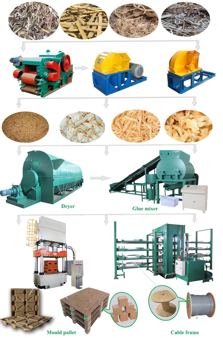 搭配木屑粉碎机、自动进料设备、电磁干燥机、储料仓、拌胶机、木屑托盘模具等组成生产线,伺服PLC全自动控制,提高生产效率。