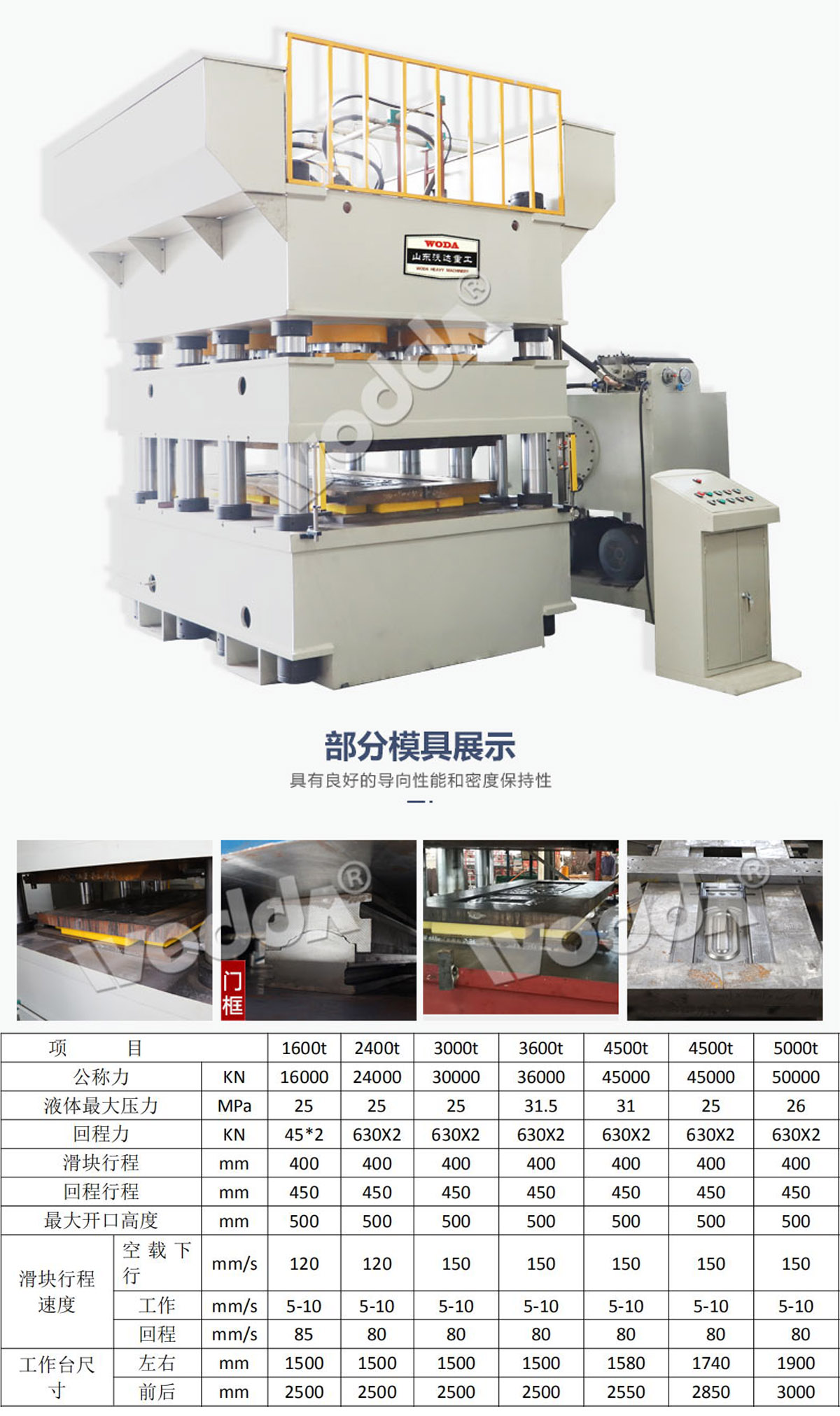 山东沃达重工专注不锈钢门面压花机研发生产多年,拥有生产2400吨钢木门压花机~15000吨防盗门压花机的经验,支持定制单动、双动钢木门压花机,产品远销海外。