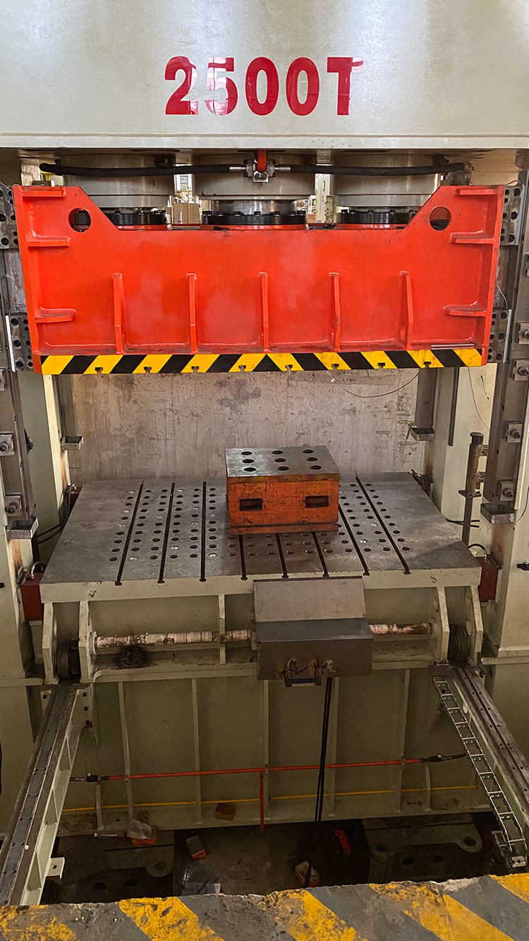 2500吨框架式液压机采用组合框架结构,均为全钢板焊接;四角八面直角导轨导向、精度高,刚性好,并采用液压预紧。液压系统采用二通插装集成阀,设有独立的液压与电器控制系统,采用按钮集中控制,可实现定程和定压两种成型工艺,具有压力显示和行程、压力调节等功能。整个系统工作稳定、可靠、使用寿命长、泄露少、故障点少。
