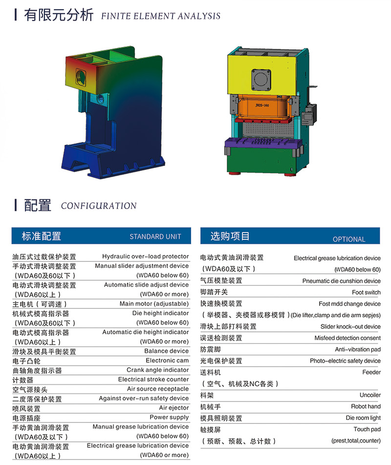 WDA-45吨精密冲床具有高强度、高精密的机架,采用钢板焊接并经退火处理,以消除床身内应力,增加机身韧性及强度。其结构件负荷均匀,刚性平衡,确保冲压的精确、稳定。这种冲床广泛用于电子、通讯、电脑、家用电器、家具、交通工具(如汽车、摩托车、自行车)以及五金零部件等行业的冲压及成型。