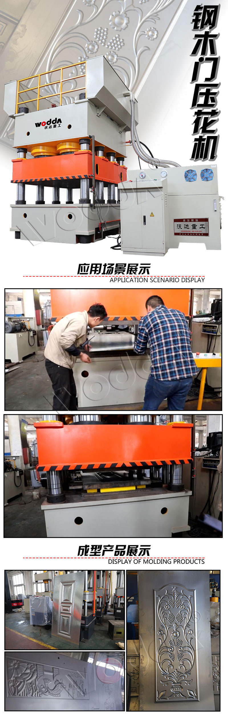 3600吨钢木门压花机,也称门面压花机、门板压花机等,是山东沃达重工专为防盗门、钢木门、室内门冲压成型门面压花专用液压机,本机是用于生产0.8mm~3mm厚的钢木门板的液压机,配有PLC和伺服系统,具有快速,安全可靠,节约能源,产品美观,成本低等优点。