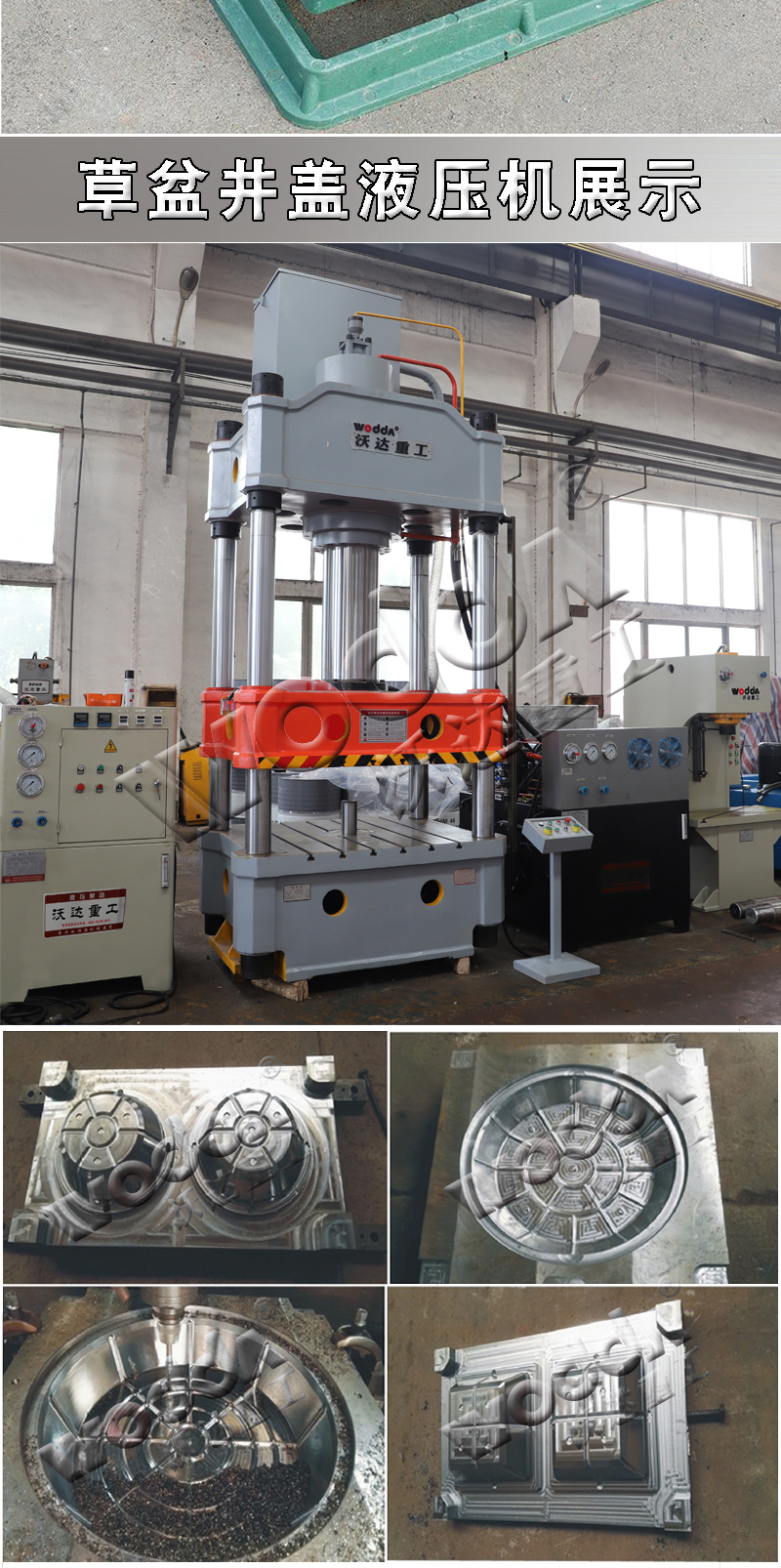 山东沃达重工研发、生产的315吨玻璃钢树脂复合草盆井盖模压成型液压机,采用三梁四柱液压机结构,机身经电脑有限元分析设计,结构布局紧凑、合理。草盆井液压机机身横梁采用优质铸件,结构强度高,工作台和滑梁表面经落地镗铣床粗铣后再经数控龙门铣精铣,保证了表面的平整度和机身的精度。立柱选用优质圆钢,经车床抛光后再进行中频淬火处理,使立柱表面的硬度达到HRC50左右,降低了安装和运输途中损伤的风险。