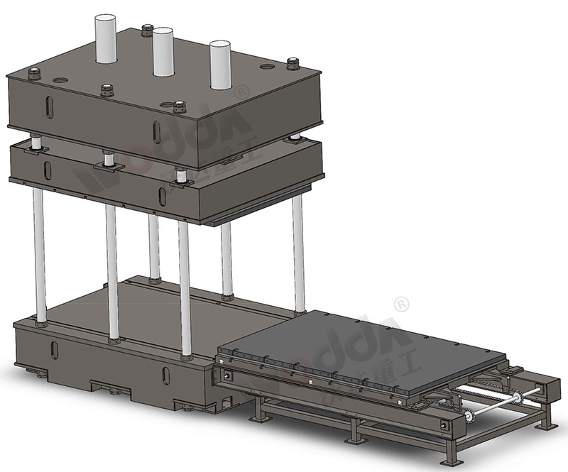 山东沃达重工研发并生产的PP蜂窝板折叠围板箱液压机,采用三缸三梁六柱结构,工作台上面和滑梁下面附有加热板,采用油加热方式,可配备模温机。另外根据板材面积大、轻薄易损的特性,设计有移动工作台装置,方便上下料,亦可配套流水生产线设计。